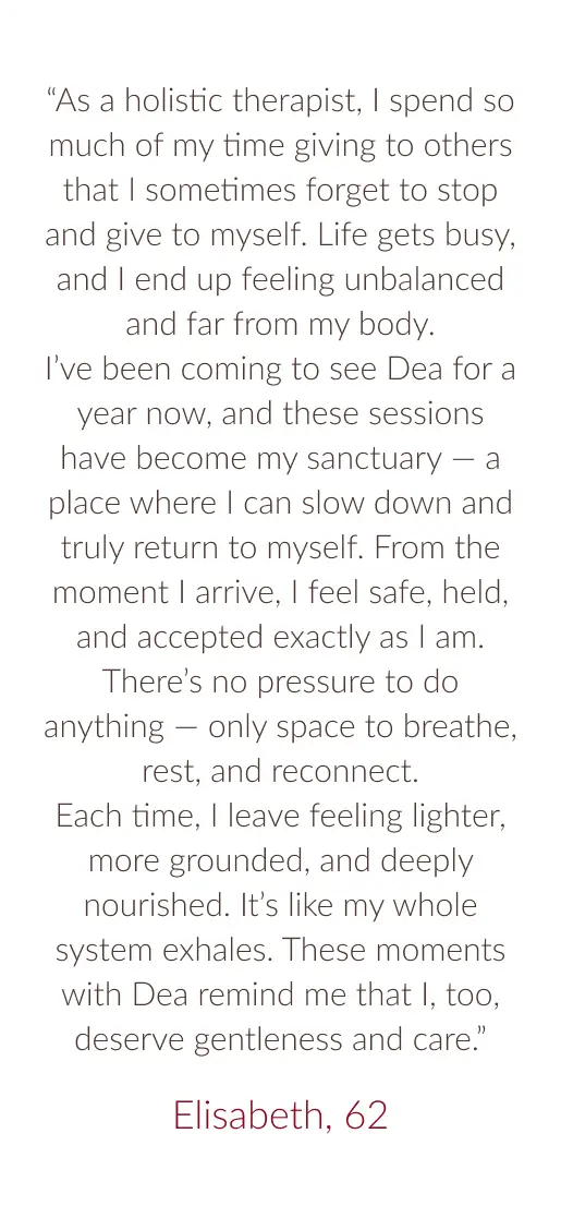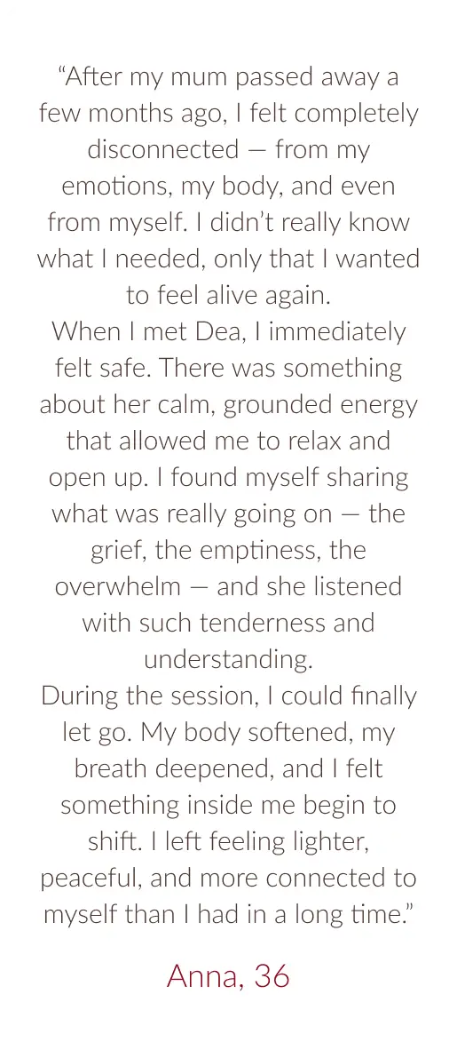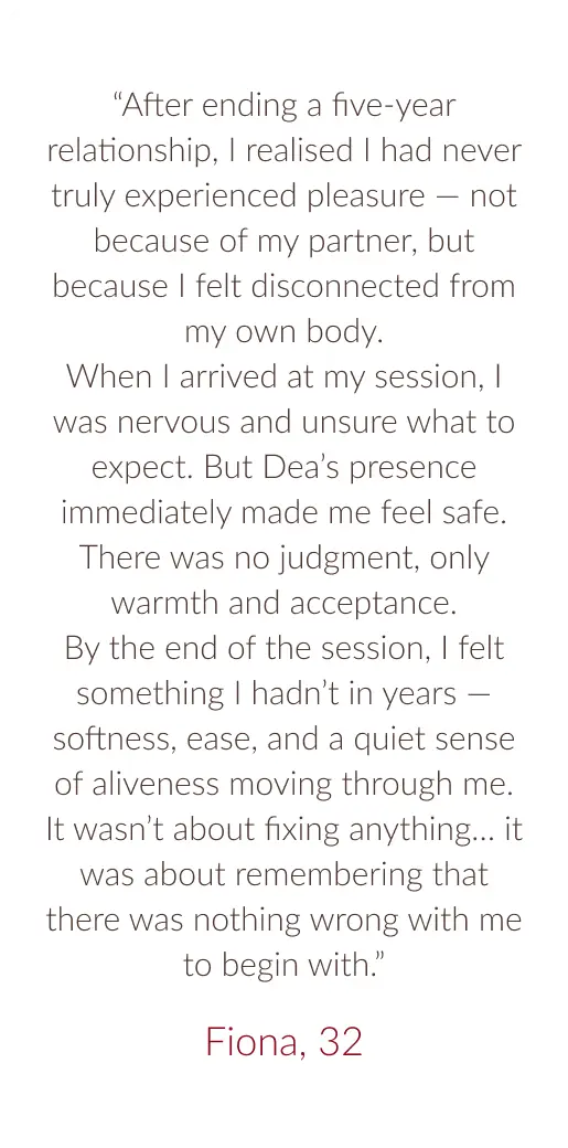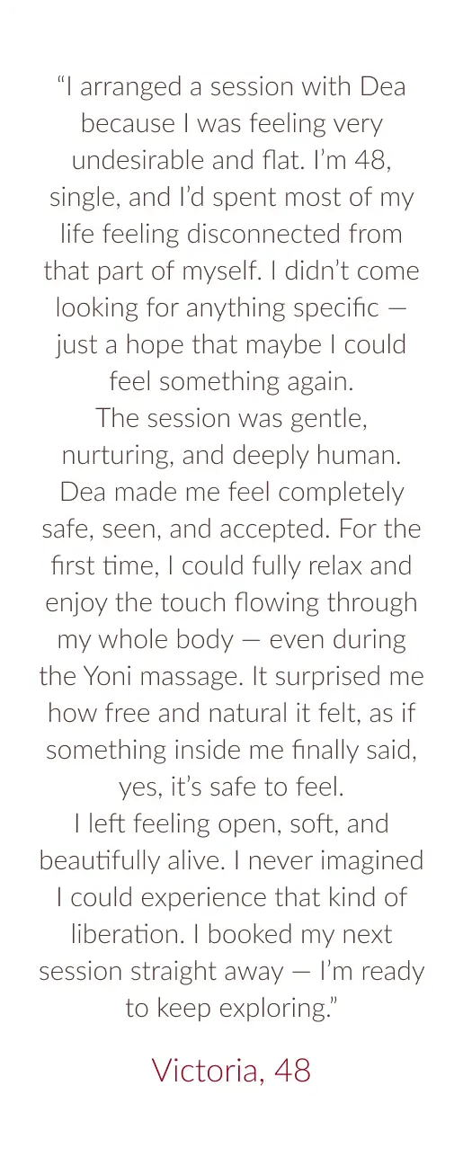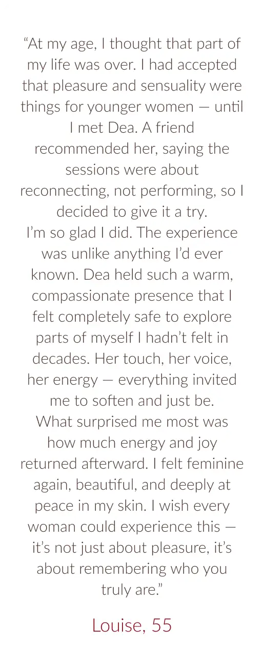 These testimonials offer a real and honest glimpse into what women experience in this work: the shifts, the relief, and the reconnection that become possible through somatic intimacy and embodiment.