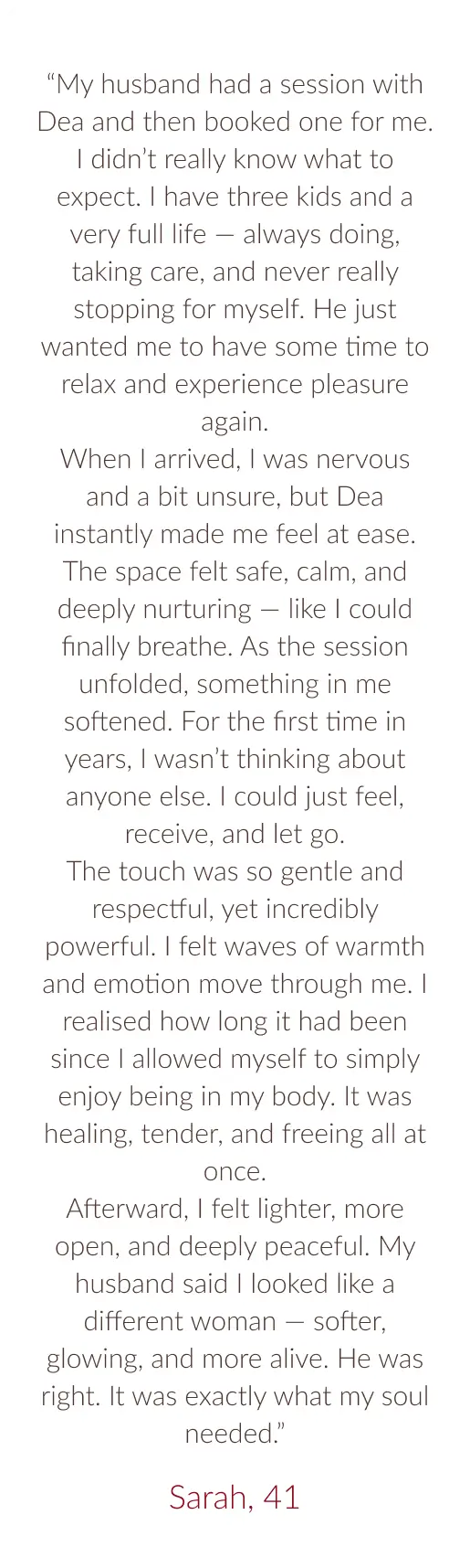 From there, your sacred journey unfolds through conscious touch, energy work, and optional Yoni Massage (female vulva) — always guided by your comfort and consent.